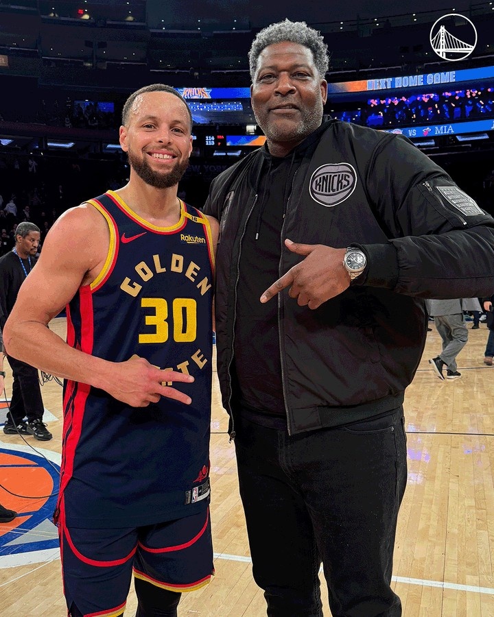 3月5日訊 勇士今日在紐約114-102客勝尼克斯。此役,庫里繼續出色發揮,全場21中10,三分9中5,砍下28分7板9助2斷!正負值+23!賽后,勇士官推曬出了一張庫里和名宿“大媽”拉里-約翰遜的合