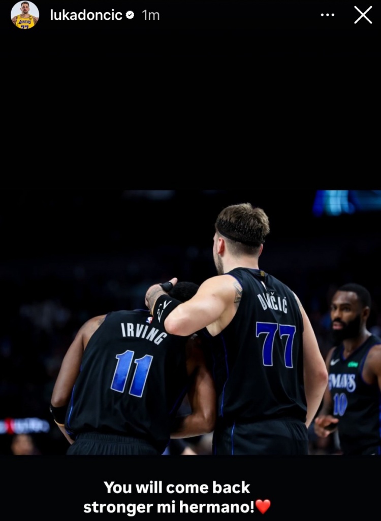 3月5日訊 今日,據著名記者Shams Charania報道,消息人士透露,獨行俠后衛凱里-歐文遭受了左膝前十字韌帶撕裂,賽季報銷。湖人后衛盧卡-東契奇更新了Instagram Story,為歐文送上