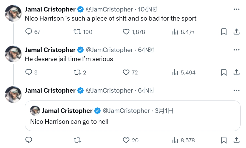快船最近2戰湖人,連輸2場,快船媒體人破防:尼克-哈里森真是狗屎,是體育屆的臭老鼠屎;我認真的,我覺得他應該進監獄。該媒體人還轉發了此前兩隊第一戰賽后的評論:尼克-哈里森應該下地獄。交易截止日,尼克-
