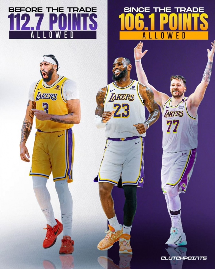 大交易前湖人場均失分112.7 大交易后降到106.1 場均降了6.6分