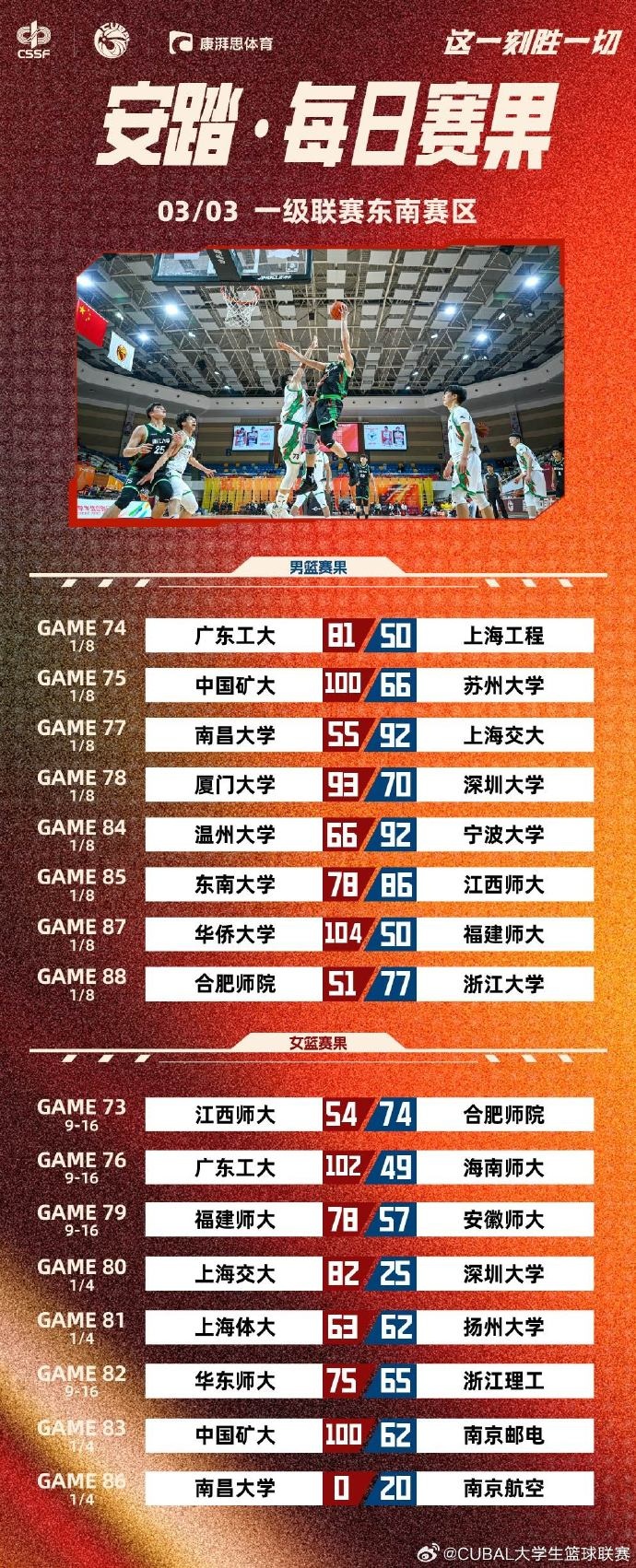 CUBAL今日賽果:中國礦大擊敗蘇州大學 華僑大學大勝福建師大