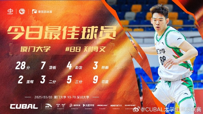 28分7板4助3斷2帽!CUBAL今日最佳球員:廈門大學中鋒鄭博文