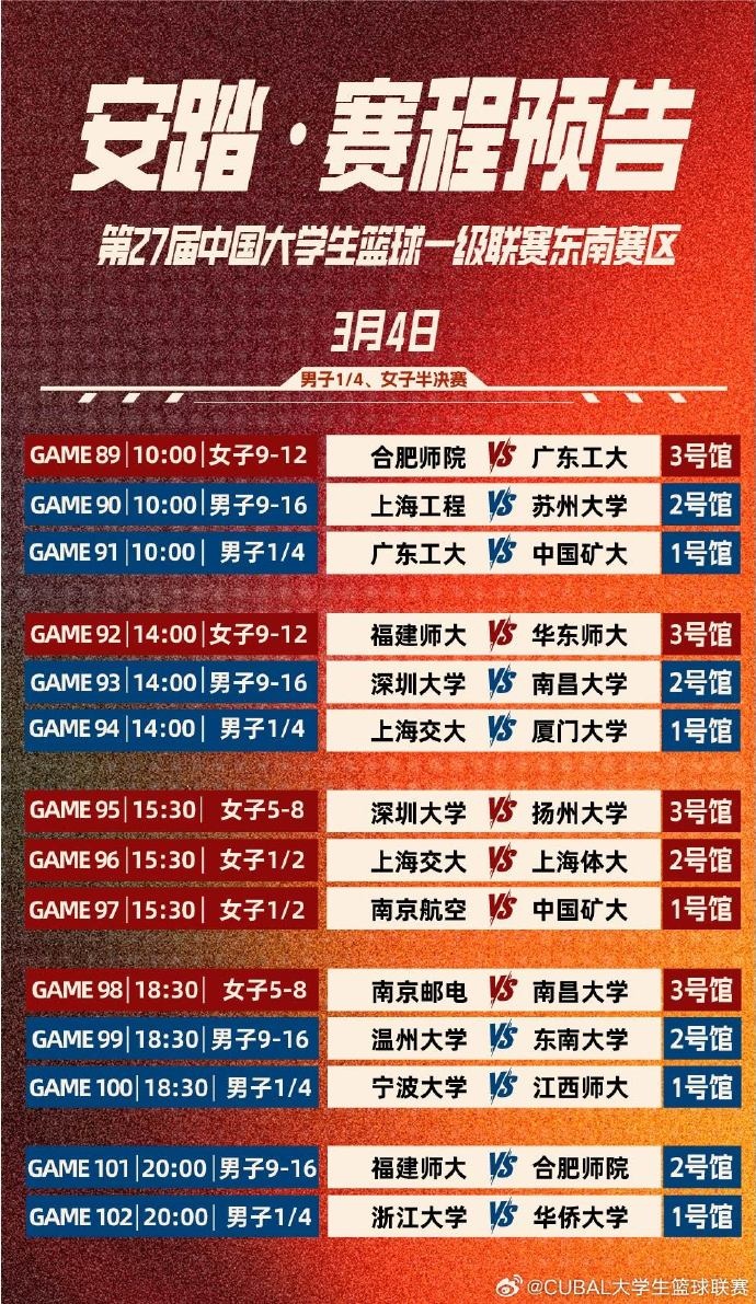 賽程預告!明日的比賽可謂是看點頗多,男子1/4的比賽場場焦點。女子方面上海交大和上海體大上演上海德比,南航對陣礦大誰能更勝一籌?