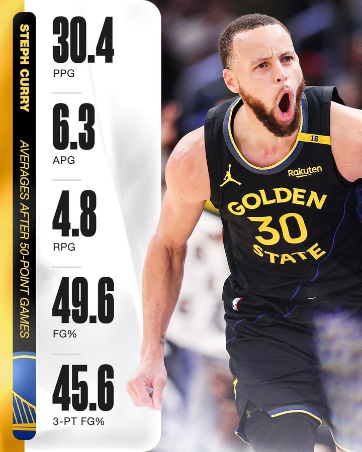 庫里50分場次過后下一戰場均數據:30.4分6.3助 三分命中率45.6%