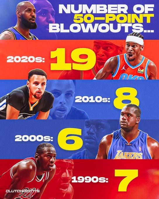 常規賽分差50+場次:2020年至今19次 20年之前30年21次