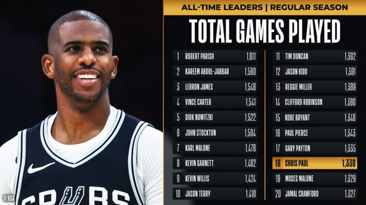 ?保羅常規賽出場數達到1330場 超越摩西-馬龍獨占歷史第18