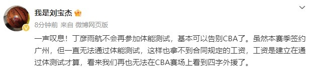 原文寫道:“一聲嘆息!丁彥雨航不會(huì)再參加體能測(cè)試,基本可以告別CBA了。雖然本賽季簽約廣州,但一直無(wú)法通過(guò)體能測(cè)試,這樣也拿不到合同規(guī)定的工資,工資是建立在通過(guò)體測(cè)試才算,看來(lái)我們?cè)僖矡o(wú)法在CBA賽場(chǎng)上看到四字外援了。 ???”