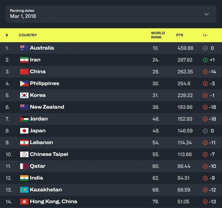 當你把最近十幾年的世界排名翻出來對照后,你會發現2018年是一個極特殊的節點。在此之前的2016年年底的排名里,中國男籃仍然能占據第14名的不俗位次,那時姚主席已退役七年之久,然而在2018年3月闊別一年的更新之后,男籃一路俯沖到第28名,自此再也沒能翻身,七年來總是被困在27-30名的區間,而日本、伊朗、黎巴嫩已悄然躍至我們前面。