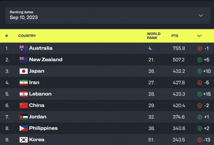接著,你還要看看對手的世界排名,據此加上第三個項,公式為1.5*(世界排名平均數-對手排名),這蘊含著擊敗越強對手獲益越多、輸給越弱對手懲罰越重的理念。2023年狀態強勁的拉脫維亞,曾短期內連續掀翻西班牙、法國、希臘在內的多支排名高于自己的強隊,世界杯正賽上更是大勝巴西立陶宛喜提第五,藉此排名從29名暴漲到前八。