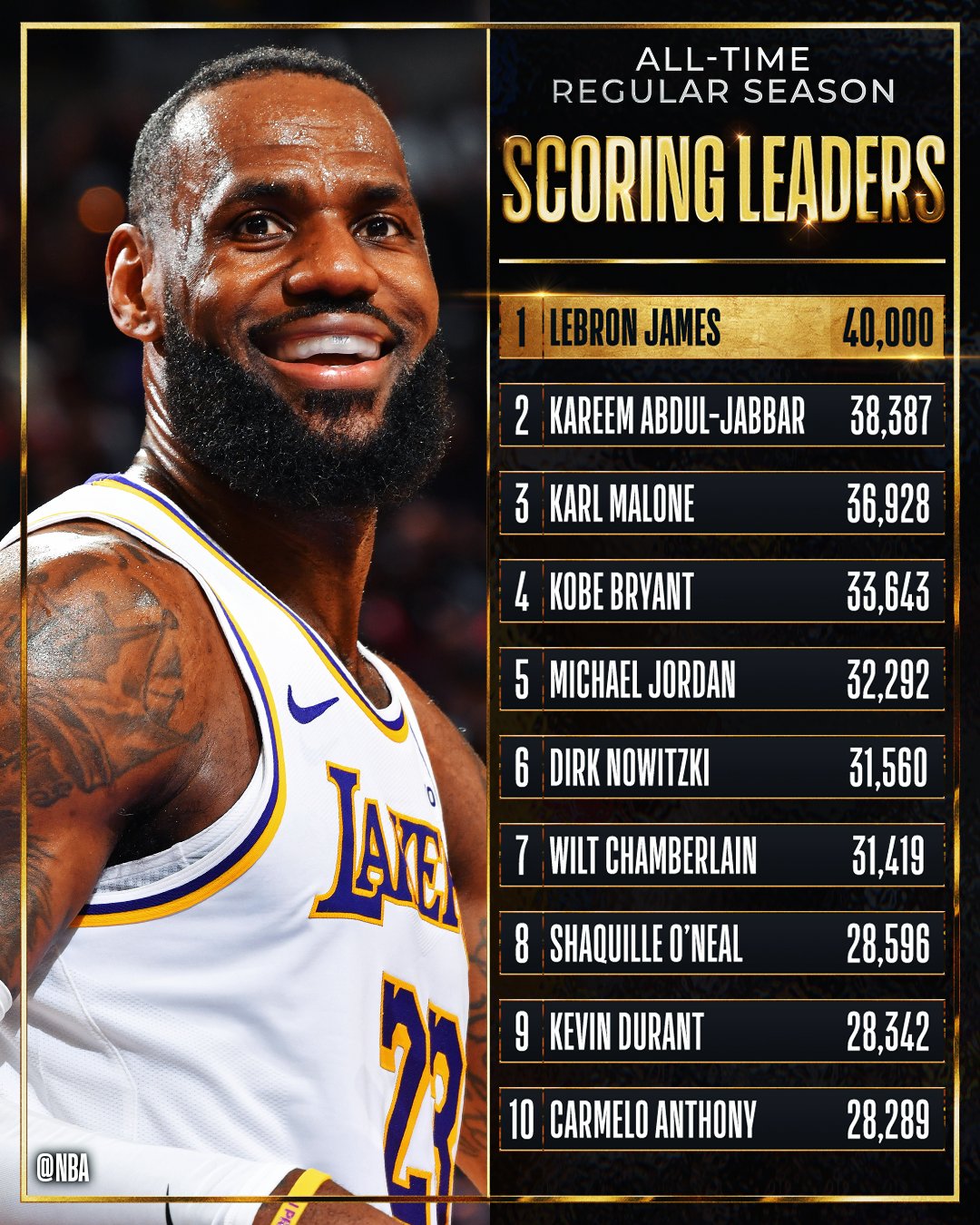 3月3日訊 去年今日,湖人球星勒布朗-詹姆斯生涯總得分突破40000,NBA歷史首人。