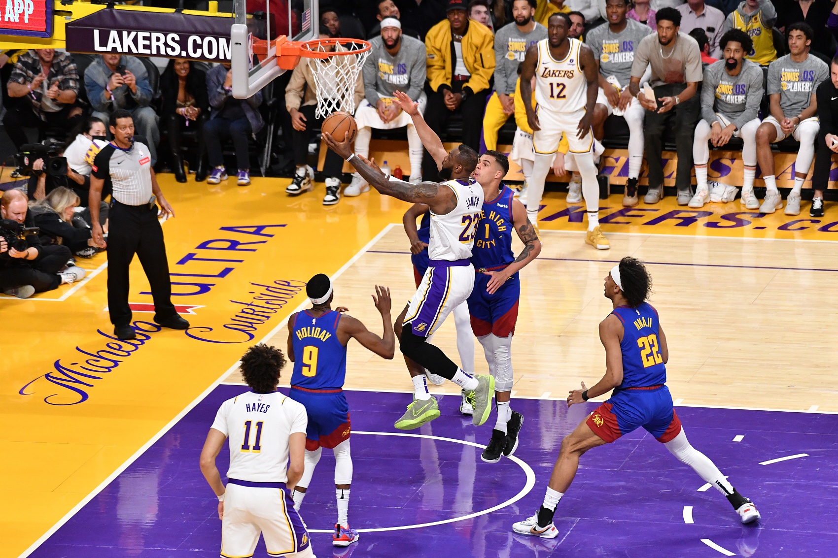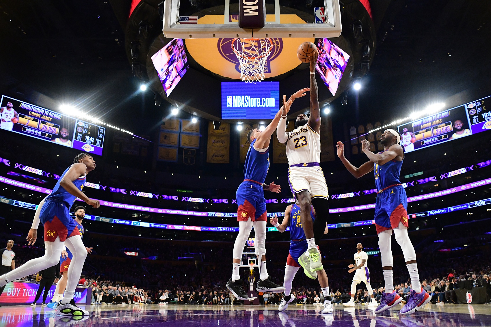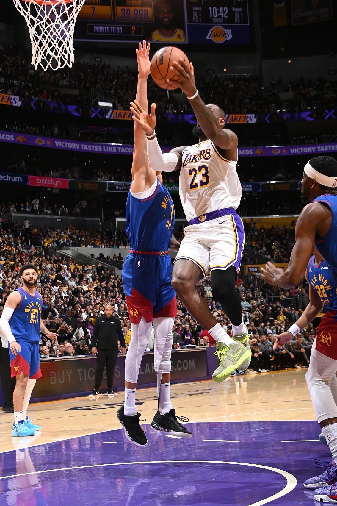 此役,湖人主場114-124不敵掘金,詹姆斯在第二節面對小邁克爾-波特上籃打進,完成了這歷史性的一刻。