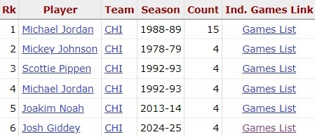 據統計,這是基迪本賽季第4次三雙,單賽季4次三雙,并列為隊史第2多,僅次于88-89賽季喬丹的15次。