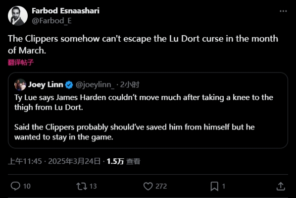 快船隊記Farbod Esnaashari發推表示:“快船在三月份似乎無法擺脫盧-多特的魔咒。”