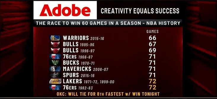 雷霆僅用72場就獲60勝&平NBA歷史第八快 第一快是16年勇士的66場