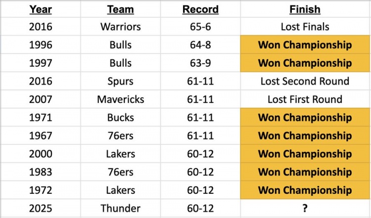 雷霆賽季前72場拿到60勝 歷史第11支 前面10支最終7隊奪冠