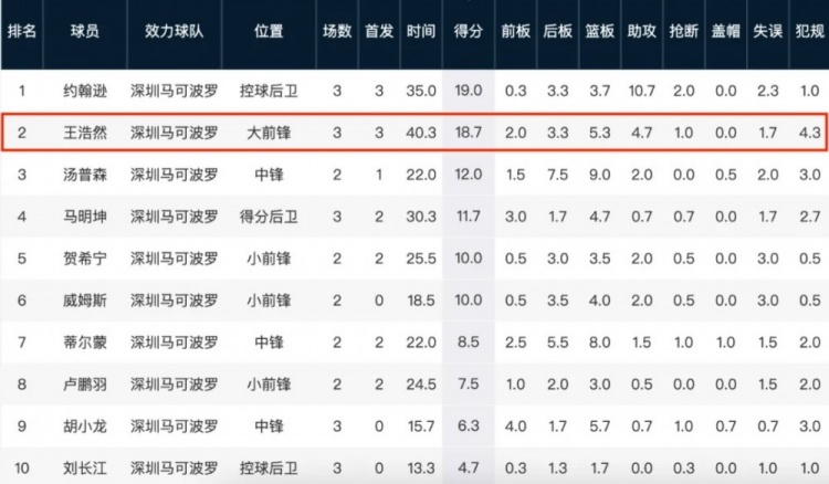 PS:當然如果把區間拉大到整個第三階段,王浩然也有場均13.3分4籃板3.6助攻1.1搶斷1.8失誤,命中率48.9%,三分命中率28%罰球命中率65%,可以說是一個很全面扎實的鋒線數據了。