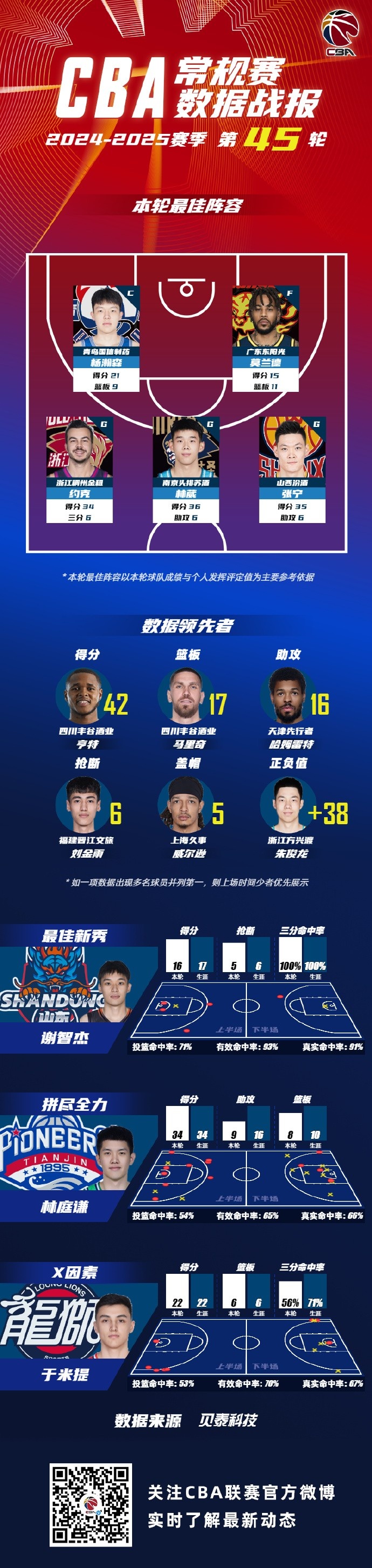 2024-2025賽季CBA聯賽常規賽第45輪結束較量,來自青島國信海天籃球俱樂部的楊瀚森,廣東宏遠籃球俱樂部的莫蘭德,浙江稠州籃球俱樂部的約克, 南京同曦籃球俱樂部的林葳和山西汾酒職業籃球俱樂部的張寧入選CBA聯賽常規賽第45輪最佳陣容!