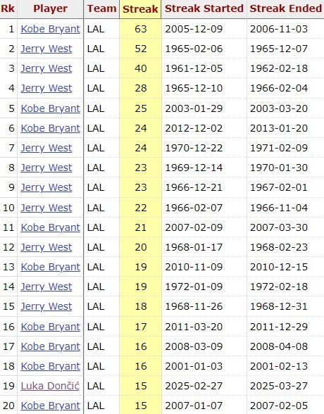 東契奇連續(xù)15場20+ 湖人隊史后衛(wèi)第3人 比肩科比和韋斯特