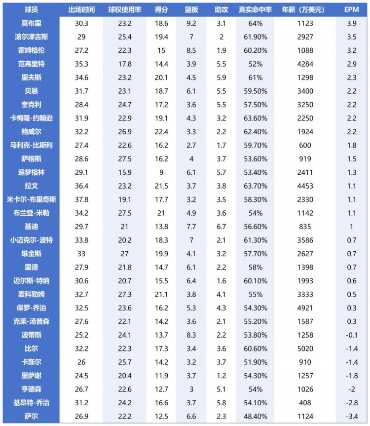 論綜合影響力,具備超強防守影響力的高大內線優勢巨大。30位三當家EPM排行榜,莫布里、波爾津吉斯和霍姆格倫分列1-3位,他們所效力的球隊均是本賽季勝率前3位的強隊。考慮到他們3人攻防兼備,這個結果不讓人意外。