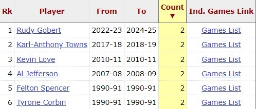 戈貝爾今天25板&10前場板 森林狼生涯第3次前場板上雙 隊史最多