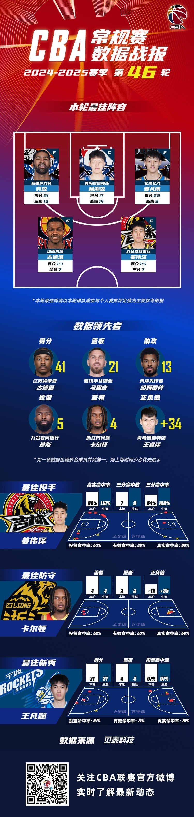 2024-2025賽季CBA聯賽常規賽第46輪結束較量,來自新疆廣匯籃球俱樂部的勞森,青島國信海天籃球俱樂部的楊瀚森,北京首鋼籃球俱樂的曾凡博,山西汾酒職業籃球俱樂部的古德溫和吉林東北虎男籃的姜偉澤入選CBA聯賽常規賽第46輪最佳陣容!
