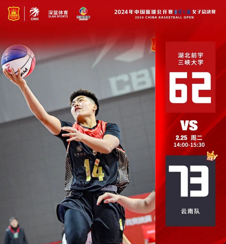 首場比賽由湖北前宇三峽大學對陣云南隊,上半場開局,兩隊打得相對膠著,比分緊咬至6平。隨后湖北前宇三峽大學加強防守,8號漆采籃下強勢,反擊中4號衛香羽、5號陸婷接連籃下得分,湖北前宇三峽大學16-9領先。落后的云南隊,不斷通過外線尋找機會,14號娜漢三分命中,幫助球隊逐漸追平并反超比分。首節結束,云南隊22-20領先湖北前宇三峽大學。次節,兩隊進攻火力不減,湖北前宇三峽大學5號陸婷依舊手感火熱,云南隊14號娜漢也不甘示弱。半場結束,云南隊39-37領先湖北前宇三峽大學。下半場,隨著體力的下降,兩隊進攻成功率都所有降低,湖北前宇三峽大學陷入短暫的得分荒,反觀云南隊在14號娜漢、6號羅菲的帶領下,多次反擊快攻得手,最終云南隊73-62戰勝湖北前宇三峽大學。