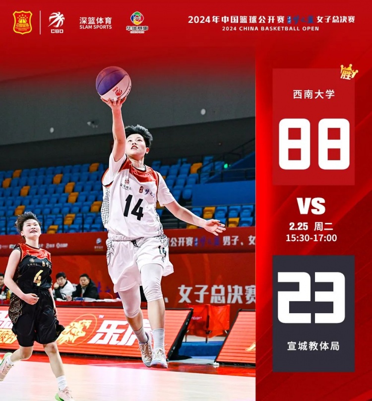 第二場由西南大學對陣宣城教體局,兩隊之間還是存在一定的實力差距。上半場,西南大學開場打出了一波16-0的得分潮,奠定領先優勢。宣城教體局面對西南大學的防守,很難取得有效得分手段。半場結束,西南大學47-15領先宣城教體局。易邊再戰,西南大學進攻依舊表現強勢,17號馮藝、7號應茵、10號李汶璐頻頻出手得分,最終,西南大學88-23戰勝宣城教體局。