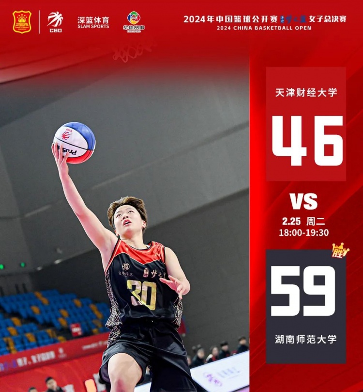 第三場比賽由天津財經大學對陣湖南師范大學,上半場比賽開始,兩隊便火藥粉十足,均表現出了強大的防守能力,首節天津財經大學14-15湖南師范大學。次節,天津財經大學全員手感不佳,湖南師范大學趁勢打出一波得分的小高潮。半場結束,湖南師范大學38-22領先天津財經大學。下半場,天津財經大學及時調整,奮起直追。8號夏榮三分命中,天津財經大學追至34-44,湖南師范大學穩扎穩打,最終湖南師范大學59-46戰勝天津財經大學。
