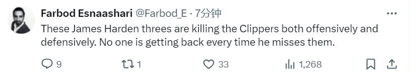 船記Farbod Esnaashari發(fā)推:“哈登這些三分球在攻防兩端都在殺死快船,當(dāng)他打鐵的時(shí)候,每個(gè)人都退不回來。”