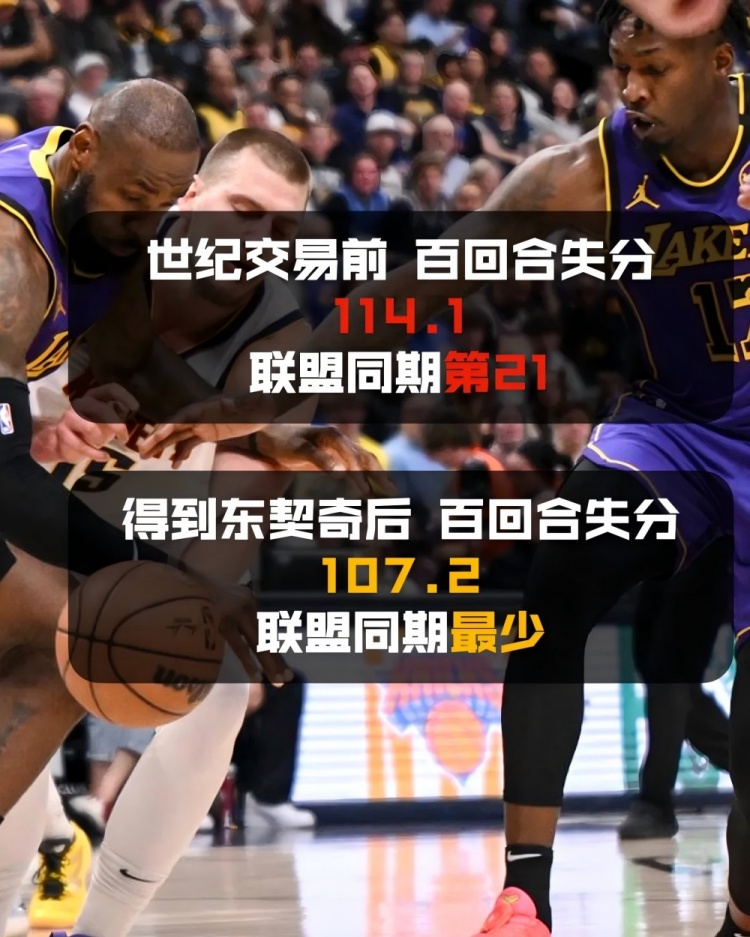 而比起進攻端如虎添翼,令人驚訝的是,他們在防守端更是打出了前所未有的質(zhì)量。在一個被質(zhì)疑“防守有巨大問題”的東契奇加入之后,湖人隊反而成為百回合失分同期最少的球隊。他們每百回合足足少丟了6.9分,成為交易日后聯(lián)盟獨一檔的防守鐵軍。