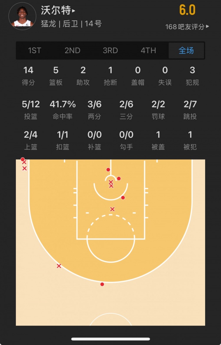 猛龍19號秀 賈科比-沃爾特 登場18.3分鐘