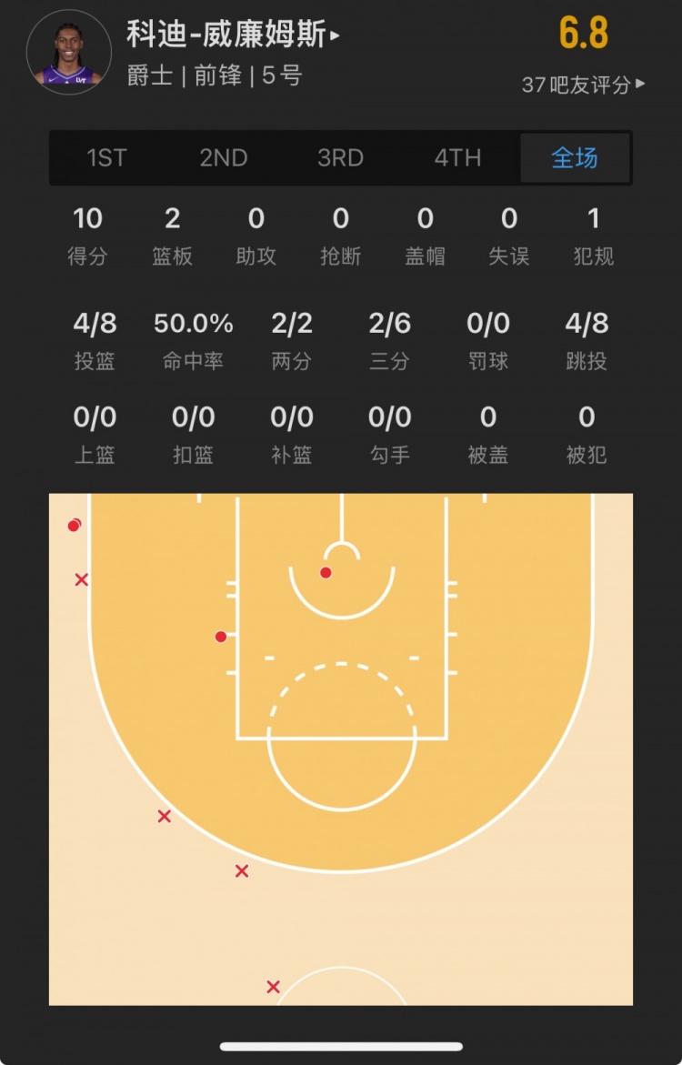 爵士10號秀 科迪-威廉姆斯 登場21.6分鐘