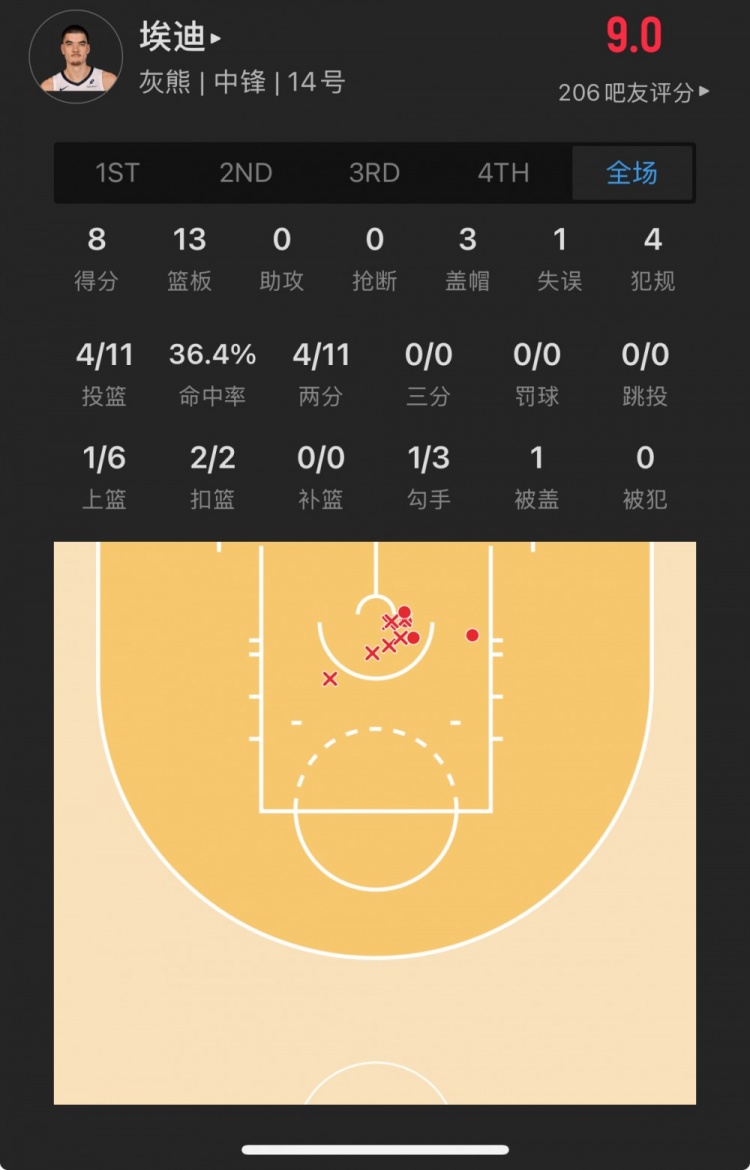 灰熊9號秀 扎克-埃迪 登場21.8分鐘