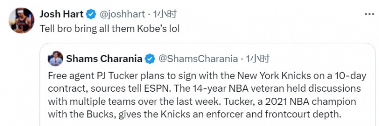 尼克斯球員哈特調(diào)侃道:“告訴兄弟,把他的所有科比鞋都帶來。”