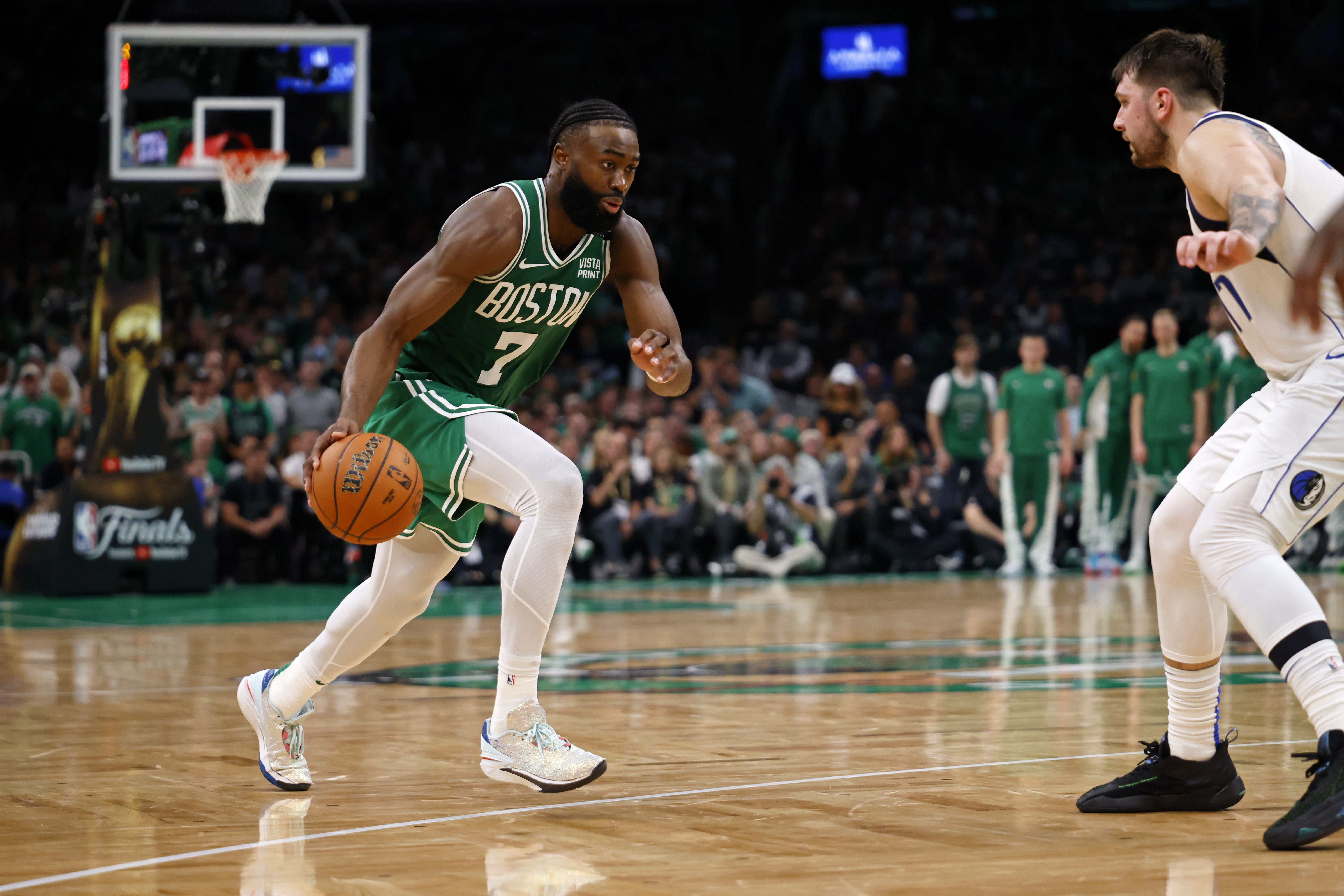 有一段時間,東契奇的表現(xiàn)仿佛重現(xiàn)了去年總決賽的場景(對凱爾特人隊而言或許并不遙遠)。凱爾特人隊早早對東契奇實施包夾,而布朗則在防守端成為核心——不斷搶斷發(fā)起快攻暴扣,并在進攻端消耗東契奇的體力。
