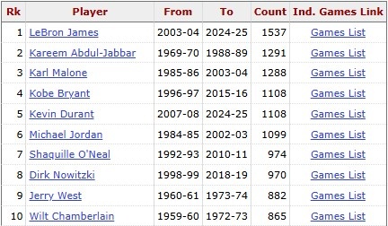 這是杜蘭特生涯(常規賽+季后賽)第1109場單場20+,超越科比,獨居歷史第四,僅次于詹姆斯(1537)、賈巴爾(1291)和卡爾-馬龍(1288)。