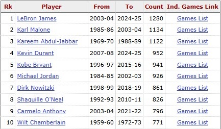 這是杜蘭特常規賽生涯第953場單場20+,同樣排在歷史第四,僅次于詹姆斯(1280)、卡爾-馬龍(1134)和賈巴爾(1122)。