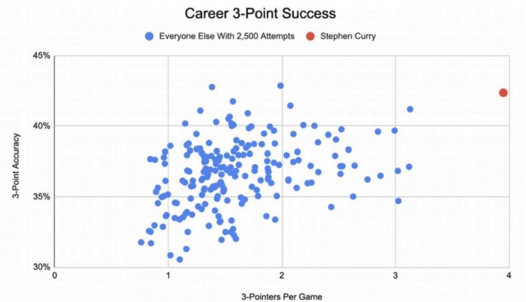 (圖為生涯至少出手2500記三分球的球員三分投射情況,橫軸為場均三分命中數,縱軸為三分命中率,紅點為庫里)