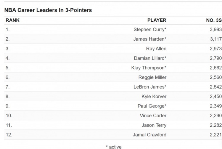 在斯蒂芬-庫里橫空出世之前,職業生涯投進3000記三分球似乎是一個遙不可及的目標。