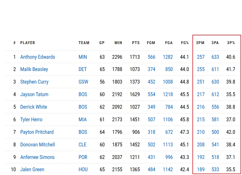 聯盟三分榜前10:愛德華茲比斯利前2 庫里和第一僅差6記三分!?