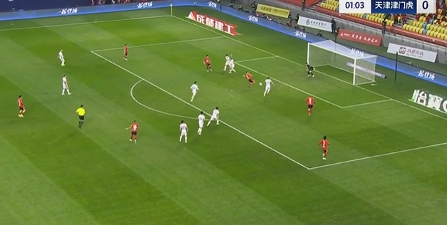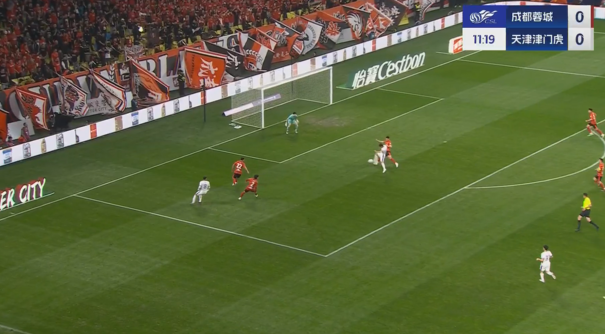 第25分鐘,蓉城扳平比分,胡荷韜右路送出精準傳中,韋世豪頭球吊射頂入球門遠角,蓉城1-1津門虎。