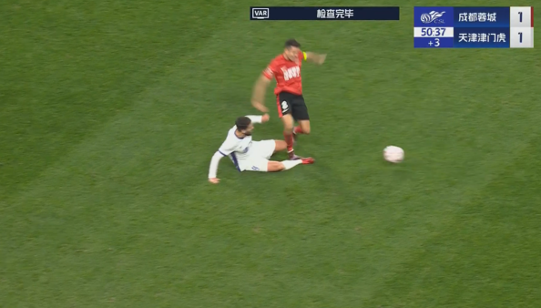 上半場補時階段,周定洋搶球時踩到哈達斯,視頻助理裁判介入,主裁判查看回放后向周定洋出示紅牌。