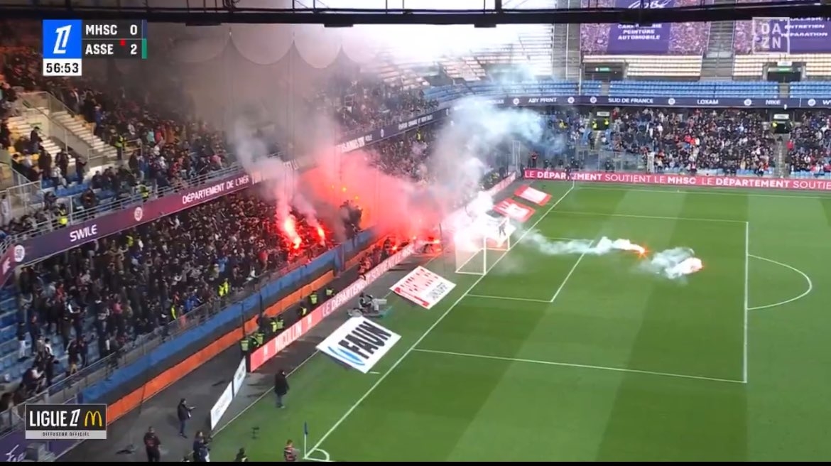 據(jù)報道,比賽期間,主場的蒙彼利埃球迷們開始燃放煙火,導(dǎo)致看臺出現(xiàn)了小型火災(zāi),最終比賽被腰斬。