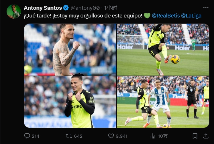安東尼在社媒發文:“太棒了!我為球隊感到自豪。”