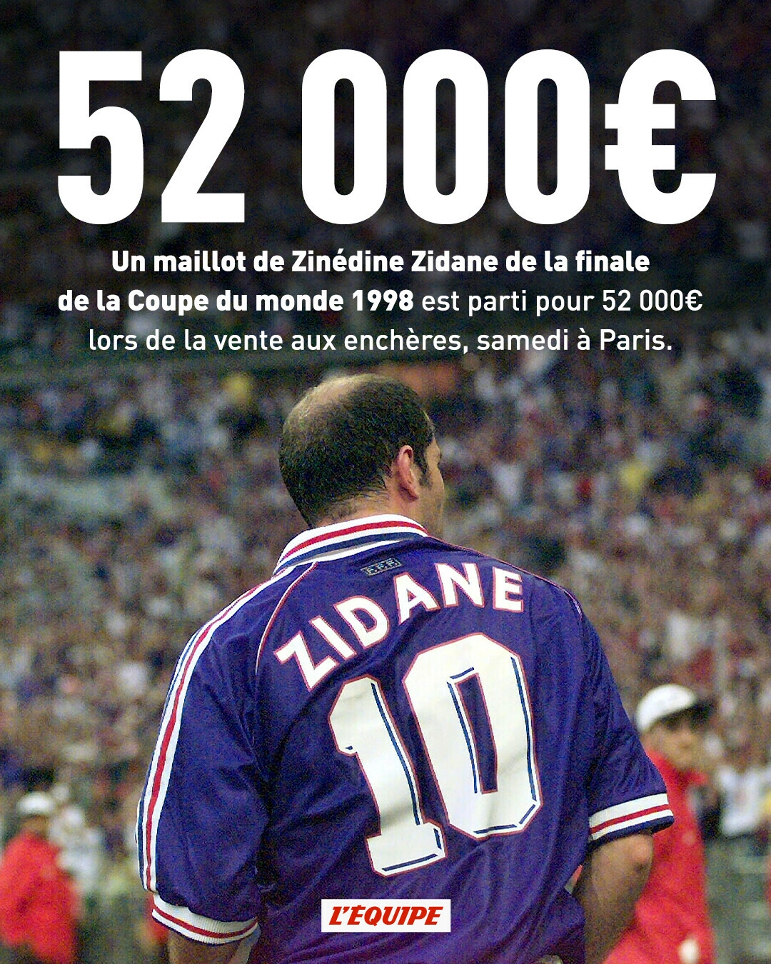 隊報:齊達內的98年世界杯決賽備用球衣拍出5.2萬歐高價?