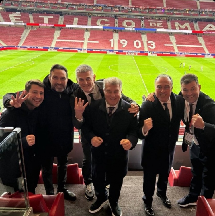 包括主席拉波爾塔在內的一眾高層賽后在現場合影留念慶祝,多人手中還比出了“4”的手勢。