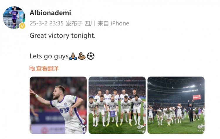 賽后,阿代米更新社媒:勝利之夜,繼續(xù)加油小伙子們。