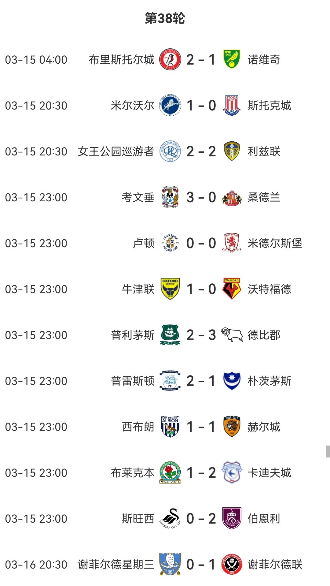 03月17日訊 周末英冠結束第38輪的較量,榜首的利茲聯戰平女王公園巡游者,被身后的謝菲聯積分追平,第3的伯恩利本輪也取得勝利,僅落后前兩名2分。