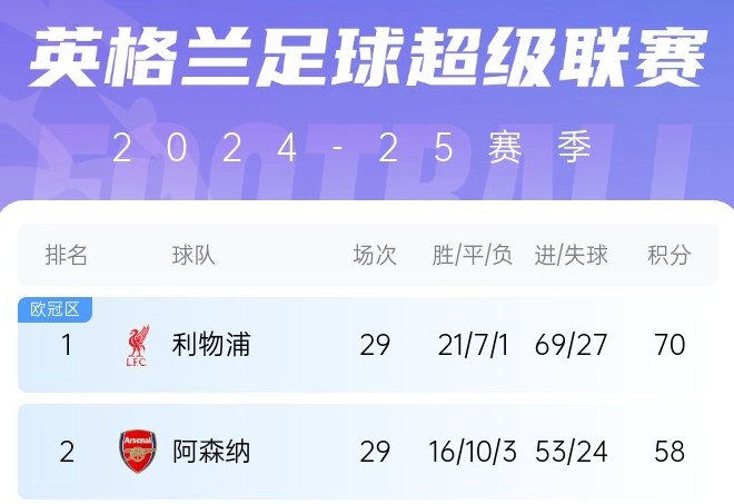 目前利物浦和阿森納均29輪賽罷,利物浦70分,領先阿森納12個積分,聯賽還剩下9輪。