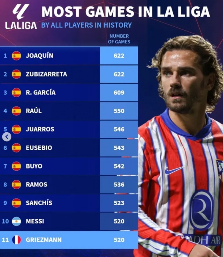 3月17日訊 馬競在本輪西甲焦點戰(zhàn)2-4被巴薩逆轉(zhuǎn),格列茲曼達(dá)成“里程悲”。數(shù)據(jù)統(tǒng)計顯示,他在本場比賽達(dá)成西甲生涯520場出場,追平梅西,并列西甲歷史出場榜前十。